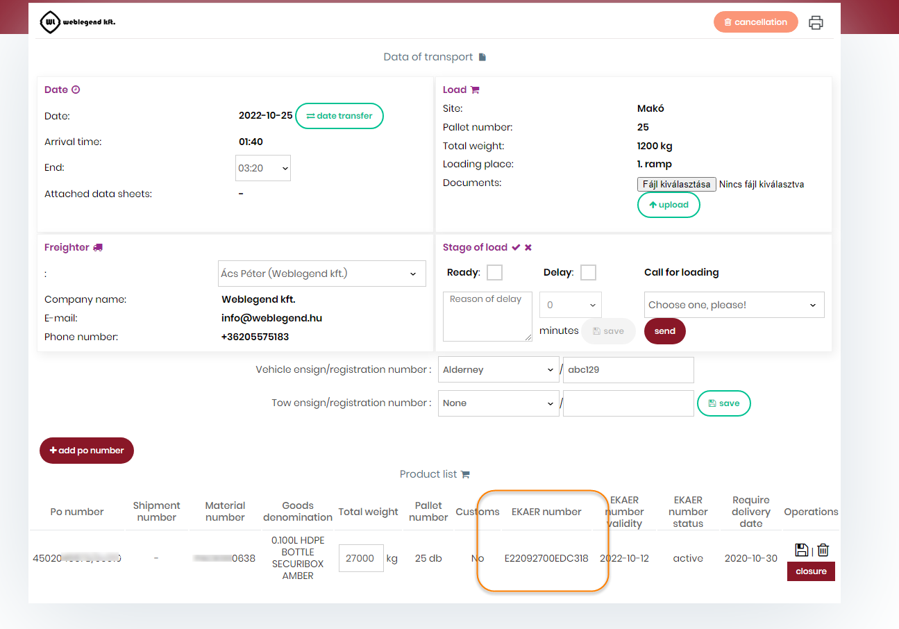 The trucksarrival software can request the EKÁER number using the data received through the interface, taking into account the legal requirements.