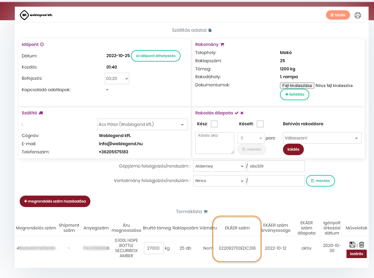 A teherautó érkeztető szoftver az interfészen érkező adatok felhasználásával törvényi előírásokat figyelembe véve képes igényelni az EKÁER számot.